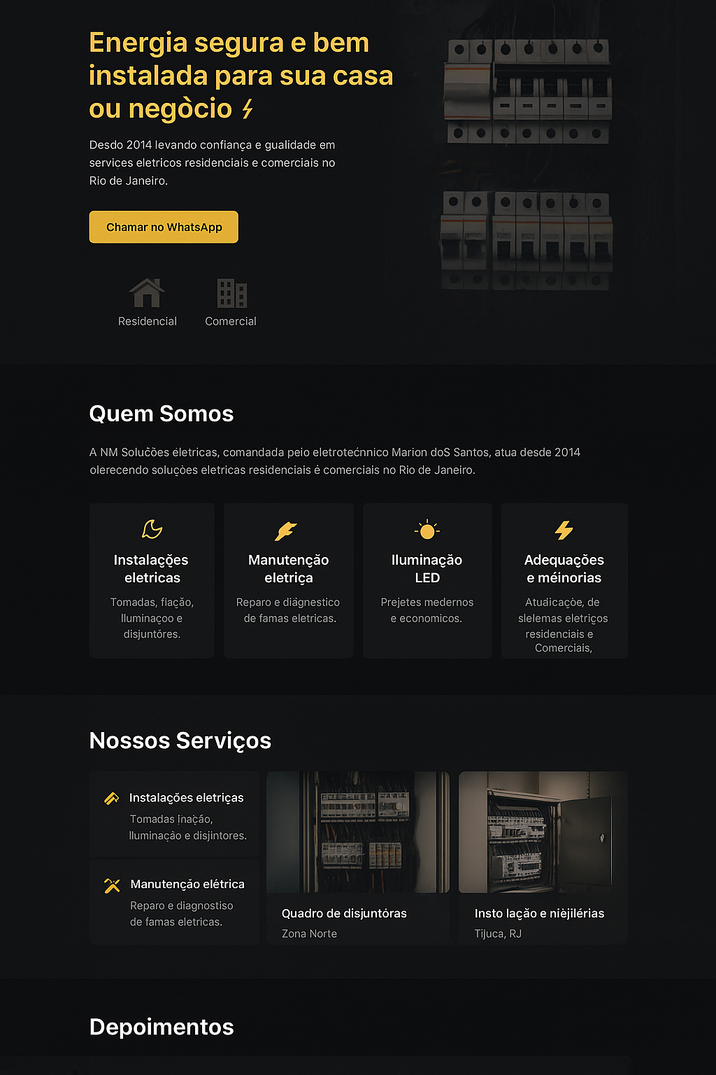 A NM Soluções Elétricas, comandada pelo experiente eletrotécnico Marlon dos Santos, é a sua escolha confiável para serviços elétricos no Rio de Janeiro. Desde 2014, atuamos com dedicação em instalações elétricas residenciais e comerciais, garantindo soluções seguras e eficientes em toda a cidade do RJ. Nosso compromisso é com a qualidade, a segurança das suas instalações e um atendimento rápido e transparente. Se você busca um eletricista qualificado no Rio de Janeiro, conte com a NM Soluções Elétricas.